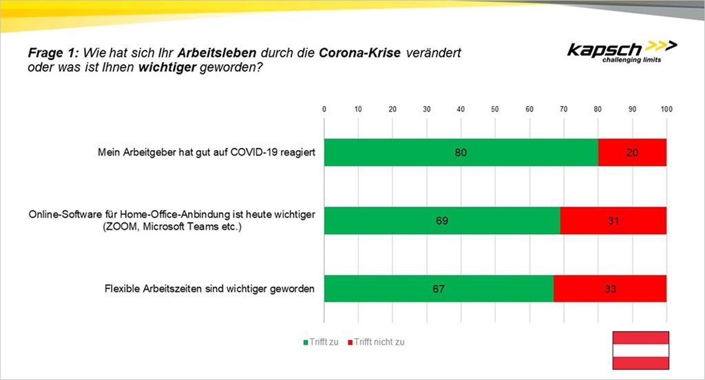 Wien, 4. September 2020 – Vier von fünf Arbeitnehmerinnen und Arbeitnehmern in Österreich stellen der eigenen Firma ein gutes Zeugnis für die Reaktion auf die Corona-Krise aus. 56 Prozent berichten von neu geschaffenen Home-Office-Möglichkeiten. Das sind Ergebnisse der Studie „Arbeitsplatz der Zukunft in der digitalen Welt“ des Digitalkonzerns Kapsch Group. Dafür wurden in Österreich bevölkerungsrepräsentativ 1.000 Arbeitsnehmer von einem Marktforschungsinstitut befragt.